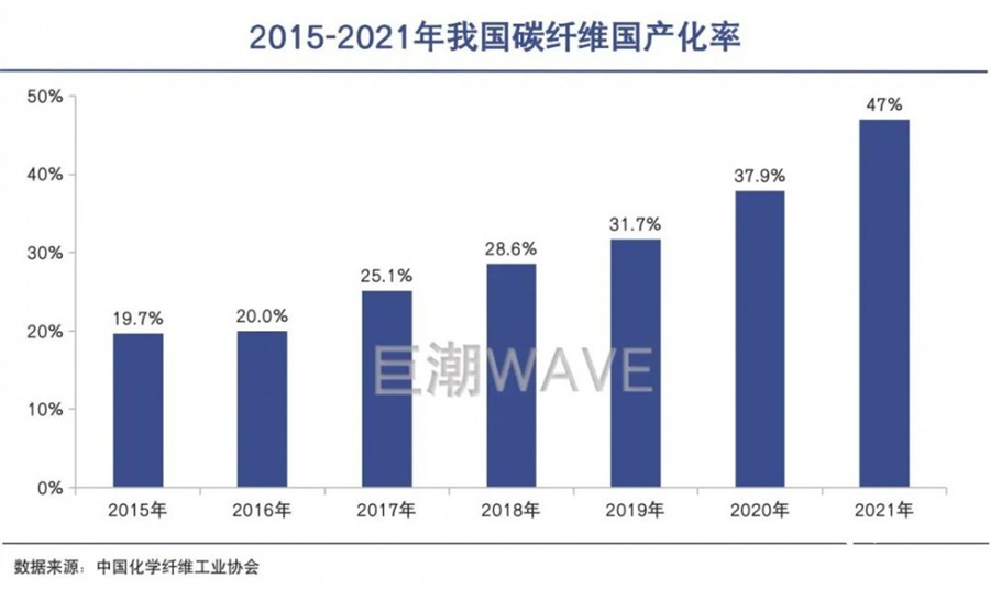 2021年,光威復材、中簡科技、中復神鷹、吉林碳谷、恒神股份5家碳纖維上市公司首次實現(xiàn)了全面盈利。碳纖維行業(yè)的國產(chǎn)化率也由2015年15%逐漸提升至2021年47%,行業(yè)迎來了第一個黃金時代。